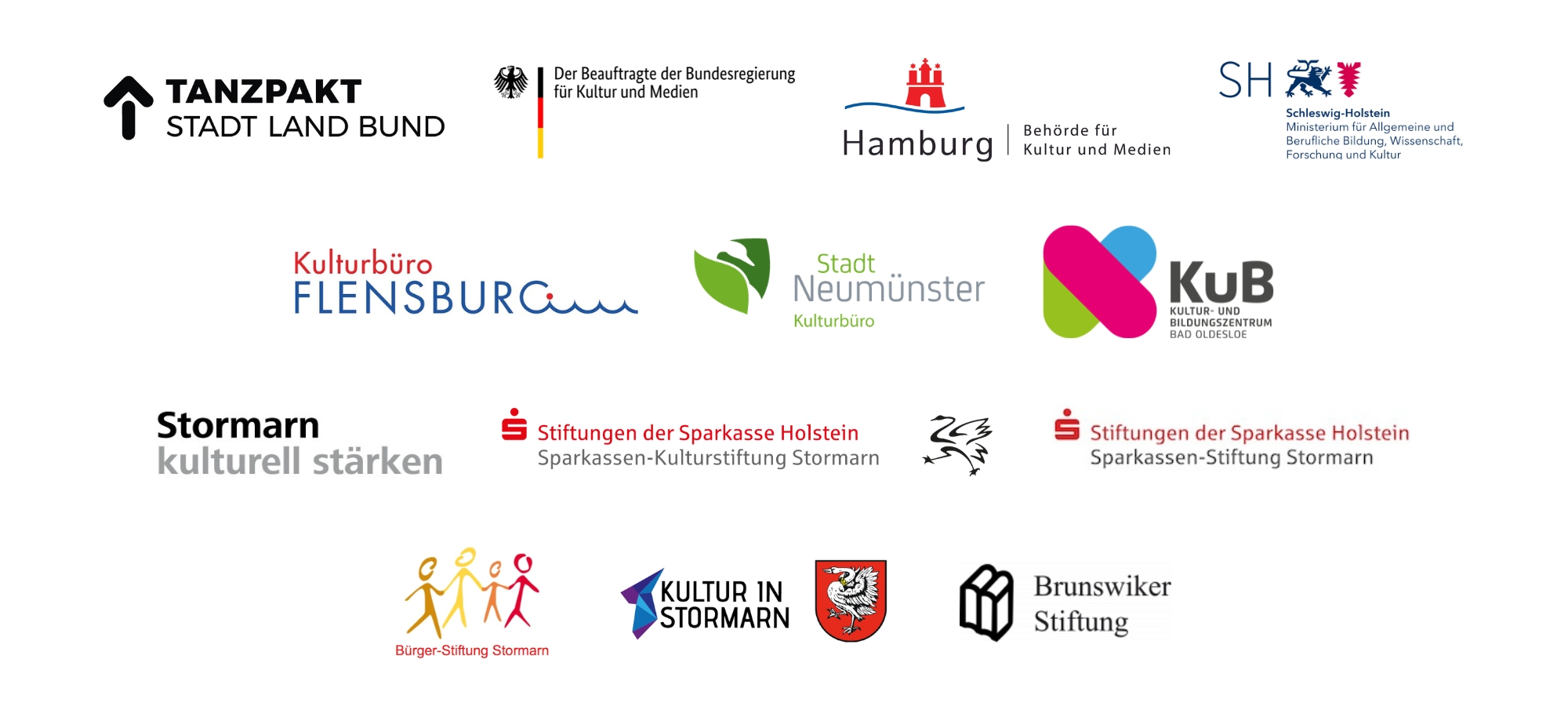 Gefördert von TANZPAKT Stadt-Land-Bund aus Mitteln des Beauftragten der Bundesregierung für Kultur und Medien, kofinanziert vom Land Schleswig-Holstein, der Freien und Hansestadt Hamburg, dem Kulturbüro Flensburg, dem Kulturbüro Neumünster, dem Sachbereich Kultur der Stadt Bad Oldesloe, der Sparkassen-Kulturstiftung Stormarn und der Brunswiker Stiftung. Das Projekt wird durch die Arbeitsgemeinschaft »Stormarn kulturell stärken« unterstützt. Die Arbeitsgemeinschaft ist ein Zusammenschluss aus dem Kreis Stormarn, der Sparkassen-Kulturstiftung Stormarn, der Sparkassen-Stiftung Stormarn und der Bürgerstiftung Stormarn.